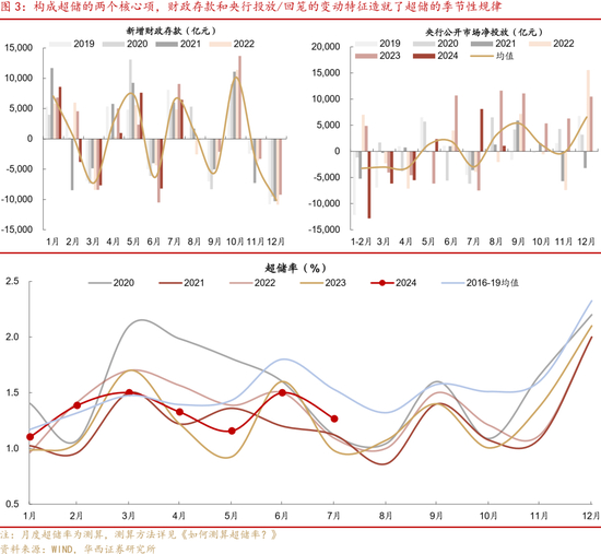 一是从超储的测算出发,本身具有较强的季节性特征,同时超储作为月末时点值,月末/季末的季节性规律使得其和月内资金面波动脱钩。传统的超储测算方法从央行负债表出发根据影响超储的五大因素进行计算,其中财政存款、央行投放/回笼两项均具有较强的季节性特征,前者体现为“季末下降、季初回升”,后者则反之,最终使得超储呈现“季初下降、季末回升”的规律。