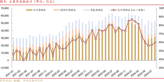 3.1.不同机构在回购市场的主要行为特点资金供给方面,呈现出银行和货基“双中心”结构。从资金供给的构成来看,银行是回购市场的主要资金融出方,而货币基金也占有一席之地,在银行资金供给下降时作为弹性供给力量。大行:资金市场上的绝对主导地位。从银行相对稳定负债来看,存款、同业存单资金整体向大行集中,也使大行成为银行间市场最主要的资金供给方,净融出资金占市场融出资金比例从2021-2022年的50%左右逐步升至80%以上,几乎成为银行机构中唯一的净融出机构,今年4月以来又逐步回落至60%左右。同时,由于信贷投放也在向大行集中,使得大行融出受到信贷投放节奏的扰动较大,因此在信贷投放加快的月份,大行净融出资金规模明显回落,较为典型的是2023年一季度。今年4月以来,大行融出规模和供给能力大幅回落,主要是受到禁止手工补息以及存款利率下调的影响,导致部分存款流出,大行资金供给能力大幅下滑,每日资金融出中枢从一季度的4.8万亿元下滑至3.0万亿左右。股份行:负债储备弱于大行,供给变化和大行趋同。股份行揽储能力相对大行更弱,因此在回购市场上融出量相对较低,每日融出资金平均在4000-5000亿元左右。其供给规律和大行趋同,在月末、季末由于指标压力融出资金大幅下降,成为资金价格季末抬升、资金分层加剧的重要原因。货币基金:得益于持仓的高流动性,资金融出能力仅次于大行。回购策略是货基主要收益来源之一,即利用产品自有资金向其他机构融出7D或更长期限以获取回购收益,或是质押利率债和同业存单向银行融入隔夜,再向非银融出资金或者配置债券,通过期限错配获取收益。由于货基持仓的高流动性(主要是存单、短久期债券),使得其在资金是市场上供给能力仅次于大行,融出资金占比达到30%左右。货币基金的融出具有明显的加杠杆套利特征,即在跨月等资金价格较高的时点,融出资金规模明显高于正常时段,即货基融出规模和资金价格存在正相关性,一定程度上作为银行资金供给下降时的弹性供给力量。