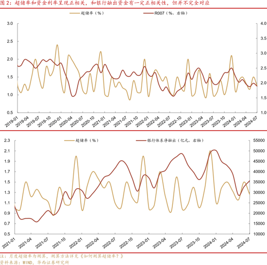 二是非银的崛起可能熨平超储和资金的关系。超储仅衡量银行可以动用的资金规模,但银行间流动性供给并不仅来源于银行,超储之外的非银存款也可以为银行间市场提供流动性。比较典型的是今年4月下旬以来的禁止手工补息政策,银行存款大量搬家,资金从银行转向非银,这使得银行间市场上资金供给结构发生转变,银行体系资金融出量大幅下滑,而货基、银行理财等非银融出资金显著上升。从历史上来看,2021-2023年间银行体系资金融出和资金利率呈现出负相关关系,而今年以来两者有所脱钩,背后核心原因就在于非银的崛起使得银行不再是回购市场的绝对主导者。