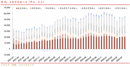 城农商行和非银是主要的资金需求方。城农商行由于揽储能力、贷款投放能力相对偏弱,主要从国股行融入资金,一方面拆借给非银机构,另一方面满足自身债券投资需求。不过城农商行本身具有一定自有资金,在市场上整体净融入资金规模相对较小,主要作为资金传导链条中的一环,充当大行和非银之间的桥梁作用。基金、理财、证券、保险和其他资管产品是主要资金需求方,处于市场流动性的末端,在资金市场上的议价能力相对较弱,其融资需求主要取决于资金价格和大行融出资金规模。当大行融出资金规模较高、资金价格较低时,非银机构则有更高的加杠杆动力,反之则去杠杆。