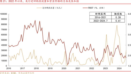 央行投放越多,资金面越松,这成为市场上普遍的一个认知误区。从直觉上来看,央行通过逆回购大量释放流动性,表征偏宽松的货币政策,银行可用资金量上升,资金利率下降。但实际上,近年来资金面偏紧的阶段,往往是央行大量投放,逆回购存量高企的时期,例如2023年8-11月、2023年1-3月。而央行持续地量操作时期,例如2021年3-5月、2022年4-8月和2023年4-8月,资金面往往偏宽松,甚至明显向下偏离政策利率,达到淤积的状态。央行逆回购投放量和资金利率呈现出明显的正相关关系,2022年以来二者相关系数达到0.61。
