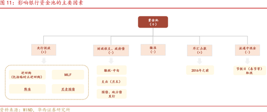 3.2.资金供需的影响因素3.2.1.供给端:资金定价的核心供给端,银行是绝对主力,影响其在资金市场融出行为的因素繁多,不过在当前阶段,财政和信贷是两个核心变量。财政方面,三大财政因素——缴税、政府债发行和财政支出,通过财政存款科目对银行超储形成“吞吐效应”,缴税和财政支出具有明显的季节性规律,对资金面的影响偏短期,主要是税期和月末,而政府债发行规律相对不定,发行高峰时期规模较大,占用资金时间可能长达数月,对资金面的影响愈发明显。信贷投放方面,虽然并不直接构成超储,但通过“信贷投放-存款派生-缴准-超储”机制消耗银行体系流动性,同时基于资产比价视角,当贷款需求旺盛时,银行往往也会削减在回购市场上融出资金,投放收益更高的信贷。央行公开市场操作,近年来更多是“削峰填谷”的作用,当财政和信贷等因素使得银行资金缺口扩大,公开市场操作力度更大。当银行高度依赖央行逆回购投放时,往往说明银行自身资金缺口较大,对应资金面偏紧的阶段。其他影响因素中,外汇占款的重要性在2015年之后大幅下降,由于其低波动性,对资金面的影响基本可以忽略。流通中现金(M0)的影响仅在春节假期前后体现,其他月份M0波动并不大,对资金面影响较小。
