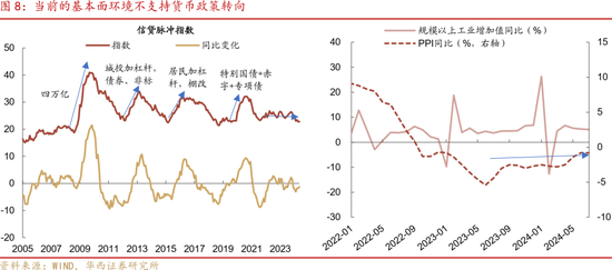 2.2.3.2022年以来:在防空转诉求下,资金利率不至于太低从2016年和2020年两个案例来看,货币政策的边际变化需要基于经济基本面改善(尤其是社融的扩张),叠加高层会议和央行货币政策表态的变化进行判断。推演到当前的情况,基于货币-信用周期框架,或不支持货币政策转向。2022年以来,信用扩张趋势不明显,社融同比增速趋于震荡。今年以来,防空转、金融数据统计调整等因素影响,叠加盘活存量,以及地方债发行偏慢,社融和M2同比整体趋于下行。从信贷脉冲指数来看,由于没有部门明显加杠杆,近两年信用周期性边际弱化,没有形成趋势。2024年1-7月信贷脉冲平均值为23.9,2022-2023年均值为25.4,均大幅低于2016年和2020年的30.8和29.0。此外,企业融资仍有待降成本。自2022年10月以来,PPI同比已经连续22个月落入负值区间,环比也持续偏弱。在内需不足的情况下,与全球大宗商品更加相关的原材料价格上涨,而中下游涨价难度大,利润向上游集中,导致中下游企业经营压力加大。为企业降低融资成本、减轻经营压力,也需要货币宽松加力。对应到当前高层会议和央行表态来看,逆周期调节之下宽货币是主要基调,但在防空转诉求下资金利率不至于过低。2024年3月两会工作报告提到“畅通货币政策传导机制,避免资金沉淀空转”,对应当前DR007中枢略高于7天逆回购利率,而难以持续、显著低于政策利率形成资金“淤积”情况。7月30日政治局会议提到“宏观政策要持续用力、更加给力。要加强逆周期调节”,而去年12月中央经济工作会议的措辞是“强化宏观政策逆周期和跨周期调节”,逆周期调节的表述也对应货币政策仍有加力的必要性。总体而言,判断货币政策的取向,如果观察到货币-信用周期有扩张趋势,同时货币政策相比于之前的“逆周期调节”等宽货币表述有所收敛,可能才是边际转向的信号。