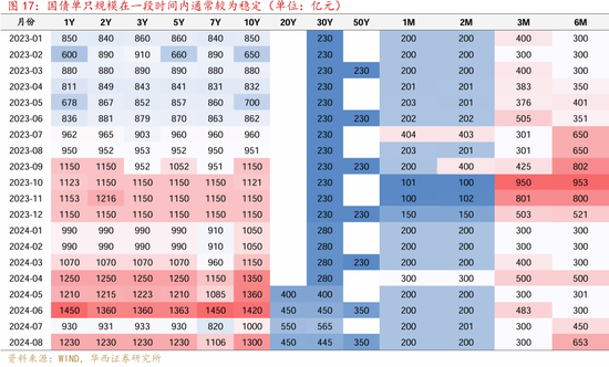 如何预测各月国债发行规模?关键在于把握单只发行规模的变化。财政部将在季度初或者上个季度末披露当季国债发行计划,不过仅披露发行期限与时间,并没有规模信息。因此,对国债发行预测的核心在于把握单只发行规模的变化。这一规模通常在1个月内较为稳定,因而我们可以结合月初最早披露的单只规模,对当月国债发行整体规模进行预估,通常与实际发行规模不会产生较大偏离。