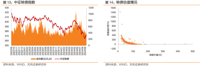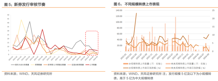 7月以来新券发行回暖,中大规模新券首日表现较往年更弱。7月至今共17只转债新发,新券发行回暖,但不同规模转债上市首日表现明显分化,9月中大额转债上市首日平均涨跌幅降自2022年以来最低,其中万凯转债发行规模27亿,9月6日上市破发,收盘价93.7元。除2022年12月19日上市的齐鲁转债(收盘价95.13元)外,最近破发转债为2021年5月24日上市的中装转2。