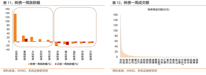 本周豫光转债、汇成转债、万凯转债、远信转债上市。两市合计249只转债上涨,占比47%,涨跌幅居前五的为远信转债(137.60%)、惠城转债(30.14%)、文灿转债(23.69%)、东时转债(12.29%)、利元转债(9.36%),涨跌幅居后五的为华锋转债(-22.18%)、精达转债(-12.56%)、溢利转债(-9.72%)、华统转债(-9.21%)、万凯转债(-7.97%);从相对估值的角度来看,407只转债转股溢价率抬升,占比76%,估值变动居前五的为东时转债(+176.51%)、文灿转债(+44.43%)、志特转债(+38.11%)、瑞科转债(+34.32%)、博22转债(+33.57%),估值变动居后五的为利元转债(-92.53%)、天创转债(-68.05%)、金埔转债(-50.52%)、漱玉转债(-40.55%)、斯莱转债(-36.69%)。