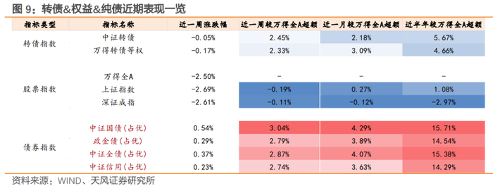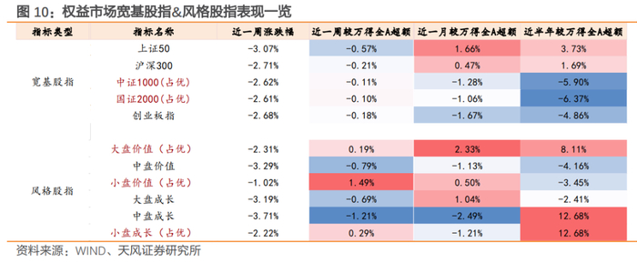 对比转债&权益&纯债指数表现,本周债券指数表现相对较好,中证国债、中证全债、政金债和中证信用近一周涨跌表现居前,宽基股指方面,中证1000和国证2000表现相对抗跌,本周小盘风格表现占优。
