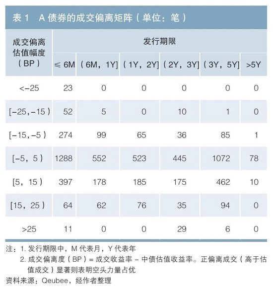 通过仔细观察可以发现,该轮调整中债券交易存在一个独特现象,即成交收益率并非单边高于估值,而是明显高于估值与明显低于估值并存,并且成交偏离的绝对值大量超出市场普遍公认的合理区间上限(5BP)。表1为某发行主体(以下简称A主体)所发债券(A债券)在2022年11月—2023年1月的成交情况统计。A主体信用质量高,投资者对其信用评级基本没有分歧,一直以来,A债券流动性也很好。但从表1可见,在该轮调整期间,不同期限A债券的成交收益率均存在显著偏离情况。对此,笔者尝试给出解释:这些成交价不是围绕估值这一个中心运行的,而是围绕至少两个不同的点分布,相互叠加、干扰,导致观测到的最终结果超出预期。