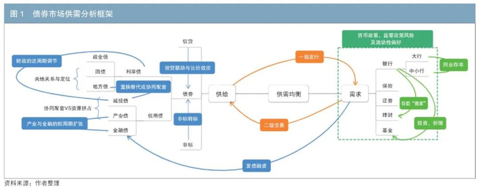 债券市场分析可以从基本面、政策面、资金面、情绪面等多角度进行。不同角度涉及的指标各有不同:有的是快变量,有的是慢变量;有的擅长捕捉债券市场短端变化,有的更多影响债券市场长端趋势;有的是先行指标用于预判未来变化,有的是同步指标善于刻画当下情况,还有的是滞后指标用来确认趋势。主导债券市场运行的主要因素并不固定,可以是单个,亦可以是多个。这就导致债券市场分析框架研究具有复杂性和运用的困难性。但债券的本质是契约,契约是双向的,无论是在一级市场发行还是在二级市场交易,都必须形成供需双方认可的唯一价格,才能使债权债务关系得以确立。因此,笔者尝试以供给与需求为核心,建立债券市场供需分析框架(见图1),并根据该方法进行案例分析。