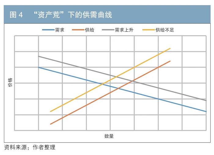 短期来看,需求曲线弯曲的形态难以改变,当供给曲线向右移动至与需求曲线相切的位置,才可达到新的均衡状态(见图4绿线)。这意味着,当一级市场恢复发行和二级市场复苏,促使交易量回升,交易价格分歧才能逐渐收敛。