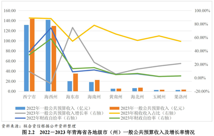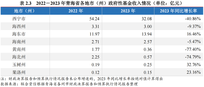 从一般公共预算收入增速来看,2023年除海西州一般公共预算收入同比下降8.60%,其余州市均实现增长。2023年,海西州碳酸锂、钾肥、原油等重点工业产品价量齐跌,税收收入较上年下降11.7%,但一般公共预算收入整体执行情况仍好于年初预算设定计划(110.00亿元)。海东市2023年一般公共预算收入同比大幅增长74.88%,主要来自盘活、处置存量资产形成的非税收入,超收收入主要用于债务化解及补充预算稳定调节基金。海南州和果洛州一般公共预算收入增速超过20.00%,西宁市和黄南州增速在10.00%以下。