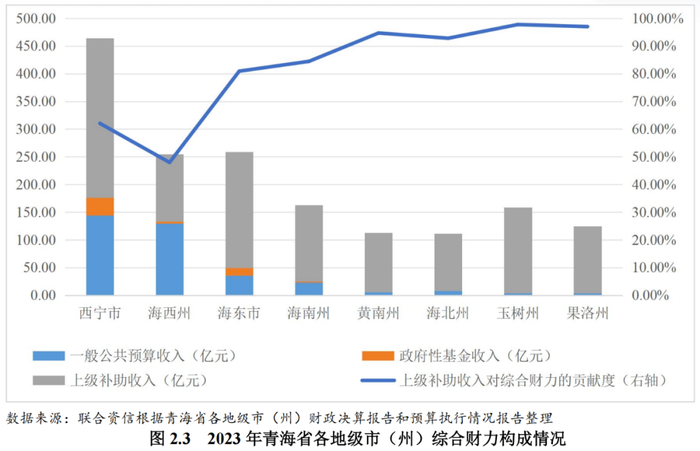 青海省各州市获得上级补助收入规模较大,上级补助收入对地方综合财力贡献度高。从上级补助收入规模来看,青海省各州市获得上级补助规模均超100.00亿元,其中西宁市获得的上级补助收入规模最大,为288.35亿元;海东市获得上级补助收入规模亦超200.00亿元,为209.56亿元。除海西州外,青海省其他各州市上级补助收入对综合财力的贡献度均超过60.00%,其中黄南州、海北州、玉树州和果洛州上级补助收入对综合财力的贡献度超过90.00%。