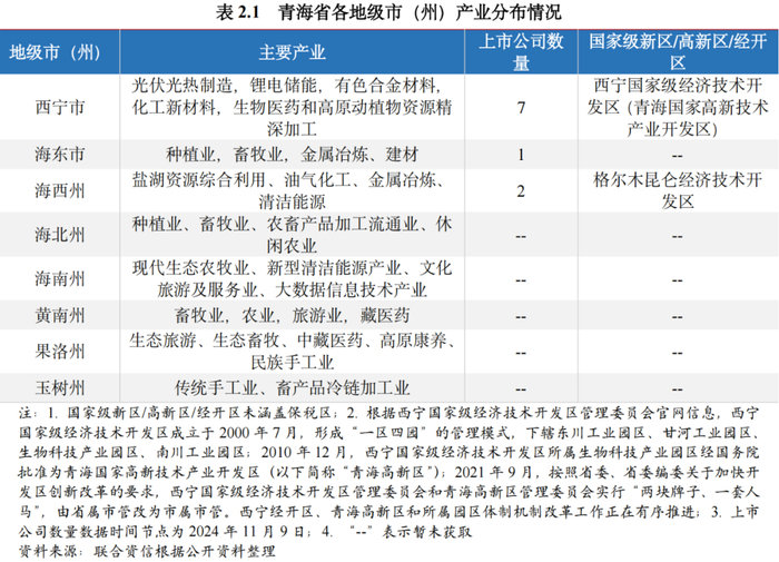 产业发展方面,受限于地理条件及资源禀赋,青海省各州市之间产业发展相对不均衡。省会西宁市以第三产业为主,第二产业占比持续提升,形成了以光伏、锂电、特色化工和合金新材料三个千亿级产业集群为主导的产业格局,集中了全省大部分的上市公司。海西州的第二产业占比为全省最高,立足盐湖资源禀赋和产业基础,海西州加快构建以盐湖产业为核心,融合油气化工、新能源、新材料等产业协同互联的现代化产业体系。海西州是全国新能源资源最为丰富的地区之一,风能资源居全省首位,具备打造“国家清洁能源产业高地”得天独厚的优势。海西州人民政府编制了《海西州“十四五”清洁能源产业发展规划》,并联合国家能源局发布了《“打造国家清洁能源产业高地”海西行动方案》,海西州发改委还成立了海西州新能源产业发展服务中心,新能源成为推动经济高质量发展重要引擎。除西宁市和海西州,其他6个州市的现代制造业发展水平相对较低,种植业、畜牧业等较为初级的产业及其相关延伸行业在经济结构中占比较高,第一产业占比均高于15%。青海省共拥有2个国家级经济技术开发区,分别位于西宁市和海西州。