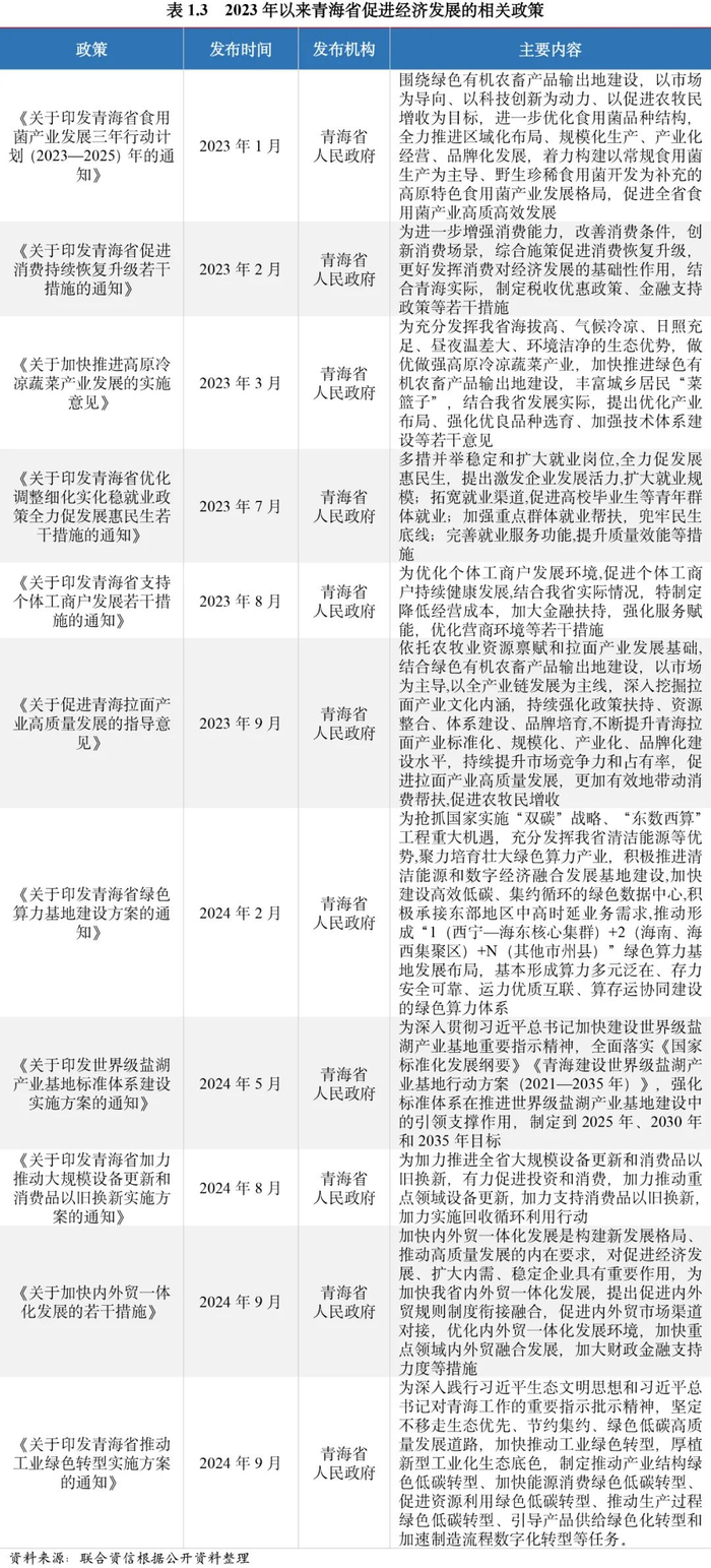 多项国家级规划政策落地助力区域发展。2005年10月,国务院六部委批准柴达木循环经济试验区成为全国首批13个循环经济试点园区之一;2007年12月,国务院六部委批准西宁(国家级)经济技术开发区为国家第二批循环经济试点园区,推动青海省形成以循环经济和工业园区经济为主的产业体系。青海省坚持生态优先原则,并紧抓“一带一路”历史机遇,加强与丝绸之路经济带沿线国家和地区的交流合作,力图把青海省建设成丝绸之路经济带的重要节点,将青海努力打造成“一带一路”上重要的物流转送中心,加强对外贸易和商务流动,输出资源性产品。2018年3月,国务院正式批复了《兰州—西宁城市群发展规划》,提出要把兰州—西宁城市群培育发展成为支撑国土安全和生态安全格局、维护西北地区繁荣稳定的重要城市群。2019年5月,国务院印发《关于新时代推进西部大开发形成新格局的指导意见》,从推动高质量发展、加大西部开放力度、加大美丽西部建设力度、深化重点领域改革等6个方面提出了多条举措,对新时代推进西部大开发形成新格局作出了部署。2023年12月,国务院正式批准了《青海省国土空间规划(2021-2035年)》,规划中提出“1群2区多点”的发展策略,对青海省未来的发展进行了全面布局。2024年8月,中共中央政治局召开会议,审议《进一步推动西部大开发形成新格局的若干政策措施》,指出准确把握西部大开发在推进中国式现代化中的定位和使命,保持战略定力,一以贯之抓好贯彻落实,聚焦大保护、大开放、高质量发展,加快构建新发展格局,提升区域整体实力和可持续发展能力。