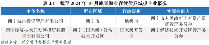 截至2024年10月底,青海省有存续债券的城投企业共2家,分别为西宁城市投资管理有限公司(以下简称“西宁城投”)和西宁经济技术开发区投资控股集团有限公司(以下简称“西宁经开”),均为西宁市企业。从发债企业主体信用级别分布看,西宁城投和西宁经开主体信用级别均为AA+。总体看,青海省发债城投企业少。