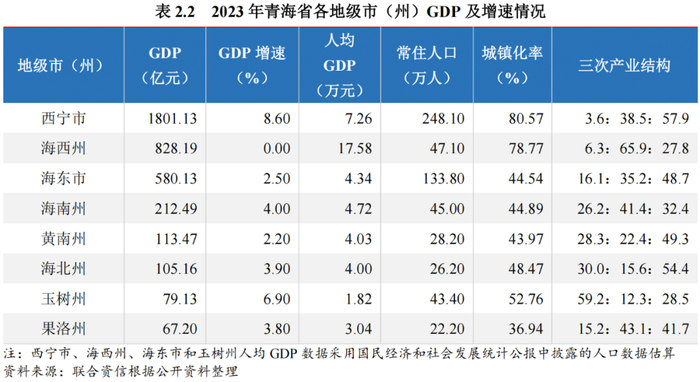 经济实力方面,西宁市和海西州经济实力较强,GDP、人均GDP和常住人口城镇化率均位于全省前列。从GDP规模来看,省会西宁市经济实力远超其他州市,2023年西宁市GDP1801.13亿元,占全省GDP的47.56%,头部集聚效应明显;海西州、海东市和海南州2023年GDP规模过200.00亿元,其余州市GDP规模低于200.00亿元。除海西州GDP总量较上年持平外,其他州市均实现正增长,西宁市和玉树州增速超过5%。