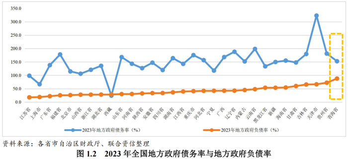 青海省整体债务负担处于全国下游水平(按照从低到高排序)。2023年,青海省地方政府债务率和地方政府负债率分别为152.50%和87.85%,在31个省市自治区中分别排名第21位和第31位。