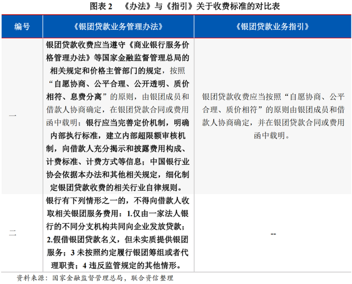 在《办法》出台前,银团贷款收费存在一些违规情况。例如,一些银行在未提供实质性银团服务的情况下收取费用,或者在未履行银团筹组或代理职责时收取服务费。此外,还存在银行强制搭售其他金融产品或服务,或以其他服务名义收取费用的情况。这些问题导致了银团贷款收费的不公平、不透明,增加了借款人的负担,影响了银团贷款市场的健康发展。针对这些问题,监管部门出台了规范收费的要求。《办法》明确规定,银团贷款收费应纳入银行服务价格管理,并遵循“自愿协商、公平合理、公开透明、质价相符、息费分离”的原则,由银团成员和借款人协商确定,并在银团贷款合同或费用函中明确载明。此外,《办法》还明确了在某些情况下银行不得向借款人收取银团服务费用,例如当贷款仅由一家法人银行的不同分支机构发放、未实质提供银团服务、未履行银团筹组或代理职责,以及违反监管规定的其他情形(《办法》与《指引》的差异详见图表2)。