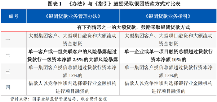 同时,为防范展业过程中的风险,银行被要求实施更为严格的穿透式管理,通过深入分析和监控贷款资金的最终用途,确保资金真正流向实体经济中最需要的领域。同时,监管强调银行必须严格控制对单一客户或客户群体的授信集中度,以降低系统性风险。《办法》延续《指引》的内容,鼓励银行在面对大型集团客户、大型项目融资需求以及大额流动资金融资时,优先考虑采用银团贷款模式;当单一集团客户的授信总额超过银行资本净额的15%时,《办法》鼓励通过开展银团贷款业务来降低银行风险集中度;对于通过竞争性谈判选择金融机构进行项目融资的借款人,银团贷款提供了一个较好的合作与风险共担平台,有助于优化资源配置,提高融资效率。此外,《办法》对分散单一银行或一组关联客户的风险暴露水平进行了修订,当单一客户或一组关联客户群体的风险暴露超过贷款行一级资本净额的2.5%时,鼓励通过开展银团业务来分散相关业务风险(《办法》与《指引》的差异详见图表1)。整体上,监管部门通过细化监管要求鼓励银行通过识别客户的风险敞口来开展信贷业务,将更加准确反应银行或客户面临的实际风险,同时,监管部门引导银行将原来根据贷款规模开展业务的模式逐步转为根据客户贷款的风险特征而开展业务,在一定程度上将提高银行对风险控制的有效性。