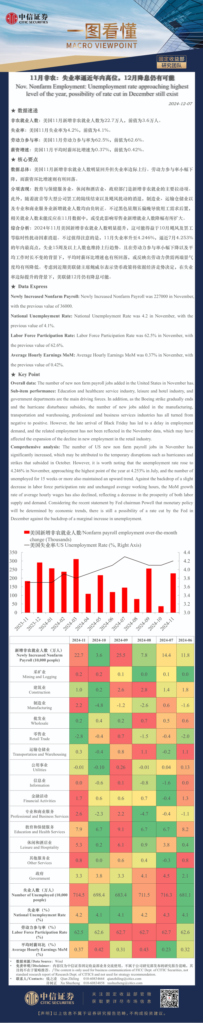 数据总体:美国11月新增非农就业人数明显回升但失业率边际上行。劳动力参与率小幅下降,而薪资环比增速则有所回落。
