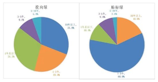 在发行期限上,广东“投向绿”债券期限结构较为均衡,1年及以下债券期限占比最高,为31.3%;其次为10年以上的债券,发行占比为31%。其中,在广东发行的“贴标绿”债券中,期限1-3年(含3年)债券占主导地位,发行占比为60%;其次为10年以上债券,占比为18%。