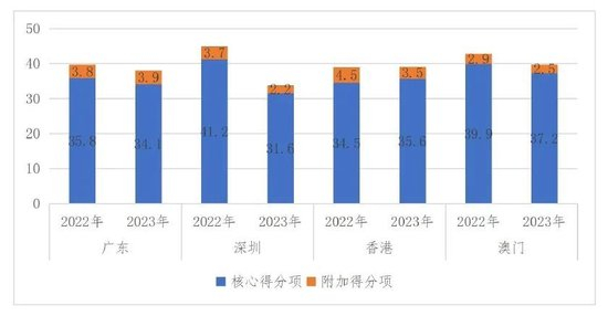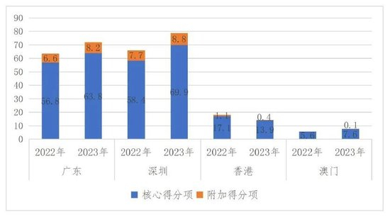 结合中债绿色指标体系,对大湾区2023年发行的“贴标绿”债券环境效益信息披露完整度进行评分5。总分由核心得分项(满分100分)和附加得分项(满分20分)构成,其中核心得分项包括环境效益必填指标披露得分与募投项目基本信息披露得分,附加得分项为环境效益选填指标披露得分。