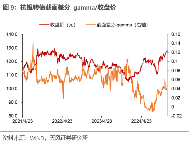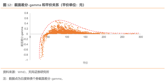 第二,平价水平对凸性有较大影响,我们选取2023年7月和2024年12月平价和截面差分-gamma的关系举例,可以看到:(1)平价在70-100元之间时转债凸性达峰;(2)平价超过100元后,转债凸性持续下降至0左右;(3)平价低于70到大于50这段区间,转债凸性随着平价下降衰减到0;(4)平价小于50后,转债呈现明显负凸性。