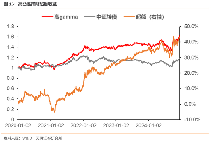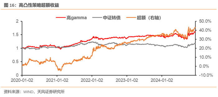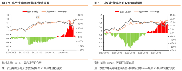 基于此,凸性对转债来说是“好属性”:当正股上行,凸性会放大转债delta收益;当正股下行,凸性会作为对冲项减少转债跌幅。从这个角度来看,高凸性转债或有一定超额收益。