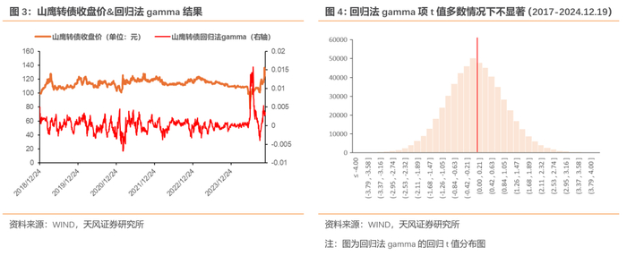 第一,绝大多数时刻转债具有正凸性。2017年至今,转债凸性为正的概率约为91.5%左右。其中绝大多数情况下截面差分-gamma值在0至0.3之间。截面差分-gamma大于0.3的情况只占4%左右。截至2024年12月19日,截面差分-gamma中位数在0.05左右,处于2019年来34.3%历史分位,2024年以来95.7%历史分位。