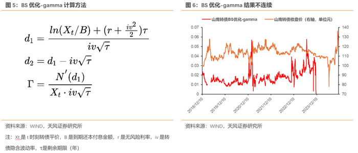 从结果来看,BS优化法确实能得到相对稳定的凸性解(我们以后称为BS优化-gamma),但是这一方案的问题是,在转债价格接近或跌破债底时,隐波不稳定或无法计算,导致BS优化-gamma无解。