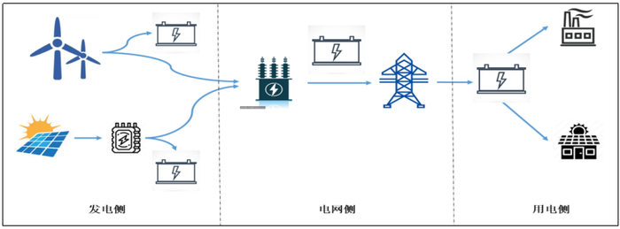 新型储能是指除抽水蓄能以外的储能形式。抽水蓄能因资源条件限制以及建设周期较长等因素影响,规模增速有限。因此,随着风光发电装机规模的迅速扩大,新型储能作为重要的灵活调节性资源,已成为构建以新能源为主体的新型电力系统的重要支撑。在“源网荷储”新型电力系统中,新型储能系统可分别在电源侧、电网侧和用电侧发挥作用。