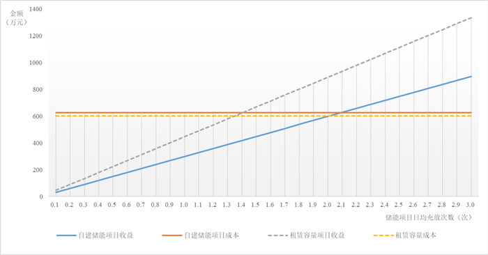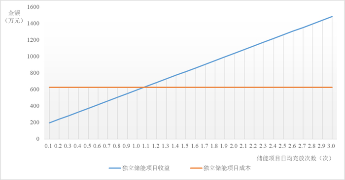 在基础条件假设下,该储能项目利用小时为180小时,相当于可提升该发电机组(100兆瓦项目)年利用小时36小时(180小时×20%);项目年均收入约75万元。如以日均放电次数为变量,伴随实际充放次数的提高,该项目年均利用效率和收入增幅明显。该强制配储单体项目成本主要为折旧费用,年均成本稳定。根据测算可得,预计日均放电2.1次的情况下,该强制配储单体项目可实现盈利。