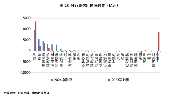 债券市场融资方面,2024年信用债市场净融资额3万亿元,同比增长约24%,信用债市场融资规模有所增长。分企业性质看,国有企业信用债发行量16.48万亿元,净融资额2.73万亿元,占2024年信用债发行总额、净融资额的比例均约为90%;民营企业信用债净融资额0.29万亿元,规模同比增长约170%,在国家陆续出台政策鼓励民营企业融资的背景下,民企融资同比有所改善,但融资企业仍主要在AA+及以上高等级头部企业,行业主要在金融、食品饮料、通信等行业。分行业看,2024年大部分行业净融资额为正数,其中银行、综合、非银金融、建筑、公用事业等行业净融资规模靠前,地产行业净融资额由2023年净融入437亿元变为净融出91亿元,地产债券融资环境有所收紧,在化债政策影响下城投净融资大幅流出,全年净融资额为-5036亿元,此外采掘、通信、国防行业净融资额也为负值。同比去年来看,城投、银行净融资规模大幅下降,反而公用、交通运输、综合、非银金融等行业融资大幅增加,一定程度上是受城投化债影响,国企或平台承担融资职能。
