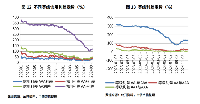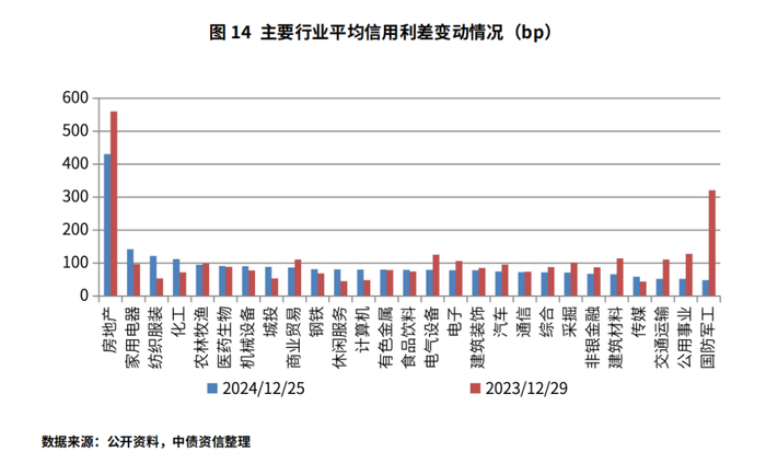 信用利差方面,2024年以来,不同等级信用利差表现有所分化,中高等级信用利差已处相对低位,全年变化并不明显,但低等级信用利差全年大幅压缩。具体而言,截至12月25日,3年期AAA、AA+、AA信用利差较年初分别上调12.05bp、10.7bp和5.96bp,同期AA-信用利差大幅下降129.49bp。等级利差方面,AA、AA+与AAA的等级利差相较年初水平小幅压缩6.09bp和1.35bp,AA-等级利差大幅压缩141.54bp。分行业看,房地产、国防军工、公用事业、非银金融等行业信用利差相较年初明显下行,而城投、钢铁、计算机等行业信用利差相较年初小幅增加,行业之间信用利差走势呈现分化。