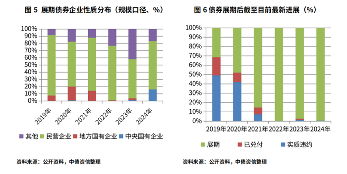 展期分布方面,本年度债券展期以一季度、二季度规模较高,展期债券品种主要是公司债和私募债,两者占比超过94%。从新增展期主体的企业性质来看,新增展期主体全部为非国有企业,行业仍以房地产为主,但也有少量贸易、化工等其他行业企业进行债券展期。从债券展期后的进展情况来看,截至最新,展期债券完成兑付的比例仅6.22%,约10%的债券后续发生实质违约,84%展期债券仍在展期进展中,其中地方国有企业展期后兑付比例接近64%,远高于其他性质主体。从时间周期看,展期债券实现兑付或实质违约的比例逐年下降,持续展期成为主流(2024年占比99.38%)。