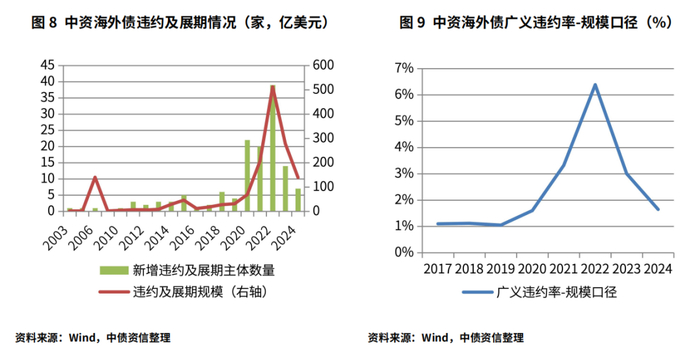 受国内房地产行业景气度依旧低迷、房企风险事件不断等因素影响,海外融资环境仍较为严峻,但随着部分风险房企逐步出清,2024年中资海外债违约及展期主体数量持续收敛,出险规模仍较小。具体而言,2024年新增海外债违约主体7家(信用穿透企业包括华南城、力高地产、金辉控股等6家企业),均为房地产开发企业,同比减少6家;违约规模为148.95亿元,同比减少84.98亿元,截至12月23日本年度未有展期债券,因此全年整体风险规模共计148.95亿元,相较去年同期减少129.14亿元。从违约率表现来看,2021年房地产信用风险暴露以来,中资海外债违约率逐渐升高至较高水平,2022年海外债广义违约率(展期及违约口径)达到4.59%,经历了大规模风险出清后,2023年以来中资地产债违约及展期主体数量及规模呈现下降趋势,2024年广义违约率为1.64%。