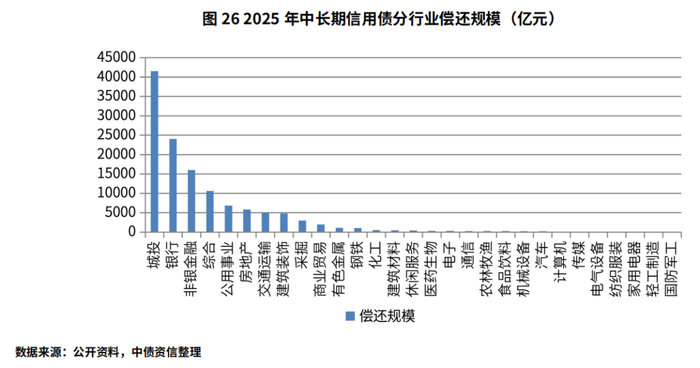 不同行业的中长期信用债偿还规模(含到期、回售、赎回、提前还款)有较大差异。2025年,城投行业4债券偿还规模4.15万亿元,相对今年实际偿还的3.60万亿元较高,预计2025年城投行业整体仍处于偿债高峰。随着“一揽子化债”政策实施效果逐渐呈现,市场对城投债券的违约预期越来越低,在低利率融资环境下,城投债被受追捧,债券发行成本降至历史低位,市场利差压缩到极致;同时,考虑到大规模地方政府债券和特别国债对城投融资的替代作用,预计城投债融资规模将继续压降,城投企业融资成本及债务期限均将继续改善。因此短期来看,城投公募债券市场发生违约的可能性很低,城投债已进入存量市场,但化债资源的获取能力直接影响着各区域短期化债落地的效果,建议综合区域财政实力、债务负担和化债资源获取情况判断城投企业化债风险。此外,城投非标债务风险仍在持续暴露,且非标债务逾期等负面舆情对企业融资环境存在重要影响,需关注区域经济财力较弱、自身经营资质较差、债务管控能力弱的城投企业非标逾期进而对标债信用风险产生扰动的风险。长期来看,随着国家逐步完善地方政府支出责任与财权相匹配的财税体制,建立地方债务管理长效机制,城投公司投融资职能长期将逐渐剥离,城投企业信用风险的核心在市场化转型效果,在此过程中需要关注部分区域城投盲目转型可能导致的资金回收风险。房地产行业2025年到期债券规模2,954亿元,含回售、赎回、提前兑付条款的债券规模2,859亿元,整体偿还规模相较2024年明显增加(2024年应偿还规模3,386亿元,实际偿还2,861亿元),叠加中资美元债市场到期规模,行业偿债压力有所提升。从内部结构来看,行业偿还规模中,民企债券规模约1,757亿元,这其中已违约或展期企业规模约969亿元,剩余高收益债券规模约525亿元,虽然房地产风险已陆续出清,但上述债券后续偿债风险需要继续关注,建议重点关注海外债券已违约企业流动性压力向国内债券传导的风险,及随着展期谈判难度加大,需要警惕展期债券转实质违约的风险。短期内,一系列宽松政策将持续助力稳定市场预期,但考虑居民购房意愿短期仍有不足,叠加二手房等对新房的替代效应将继续加深且高能级城市替代程度更为明显,预计商品住宅销售面积仍将负增长,但结合基数效应预计累计同比降幅将有所收窄。在经营性现金流未有改善和融资环境仍处低温影响下,房企短期流动性压力仍存,竞争格局洗牌仍将持续,行业风险可能进一步出清。随着行业内风险逐渐出清,建筑装饰行业2025年行业偿还债券规模4,793亿元,存续债券企业以央企、地方国有企业等大型建筑企业为主,信用风险余量已逐渐减少。但建筑细分领域分化逐渐加大,电力工程、水利工程等领域行业景气度较高,但市政建设领域竞争激烈,回款质量变差,房建领域景气度持续疲软,回款风险加大,需要警惕市政建设、房建领域建筑企业的款项回收情况、坏账计提对盈利的侵蚀及企业流动性压力。中长期信用债偿还规模较大的行业还包括非银金融、银行、公用事业等。其中,银行随着金融化债持续推进,银行实质资产质量将出现边际弱化,金融高质量服务实体经济持续推进,预计银行净息差或继续压缩,银行盈利能力边际弱化,银行业内分化将加剧,需重点关注弱区域银行资产质量下行压力以及实际资本缺口较大的城、农商行的资本补充压力,以及在资本补充压力下次级、永续等债券不赎回风险;非银金融资产质量下行压力相较银行更为突出,需重点关注资产质量弱化明显、资本补充压力或再融资压力较大的机构相关风险;钢铁行业受出口回落及地产用钢需求拖累影响,2025年行业需求仍将小幅下滑,供需格局或进一步弱化,企业盈利将进一步下行至近年来低位。但考虑2025年钢铁行业偿还债券规模仅约千亿元规模,且企业主要是利润积淀深厚的央国企,因此预计2025年行业债务风险可控,重点关注信用资质相对较弱的弱国企、民企在利润持续亏损情况下融资环境的变化及带来的流动性压力。