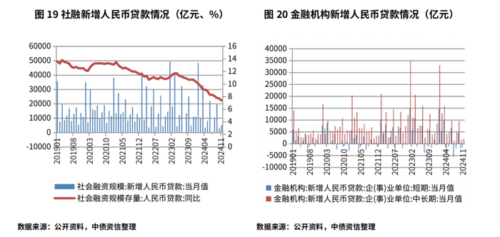2024年,我国经济运行总体平稳、稳中有进,三季度GDP累计同比增速4.80%,但国内有效需求不足问题仍存。融资环境方面,总量方面,全年2次年初降准共1个百分点,释放长期流动性约2万亿元,并综合运用公开市场操作、中期借贷便利、再贷款再贴现等工具及国债买卖,保持流动性合理充裕。截至11月末, M2增速为7.10%,微幅扭转全年增速持续下行的趋势;利率方面,下调支农支小再贷款、再贴现利率0.25个百分点,下调公开市场7天期逆回购操作利率2次共0.3个百分点,引导贷款市场报价利率(LPR)等市场利率下行,1年期LPR下降35bp,5年期以上LPR下降60bp,社会融资成本稳中有降。社融方面,截至11月末社融存量规模405.60万亿元,同比增速7.80%,受民间投融资意愿低迷影响,社融全年增速有所下降。