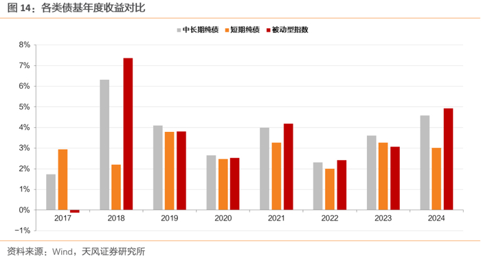 结合长维度的历史数据看,也体现出被动指数型基金的收益表现与主动管理型的差异不大,2024年甚至优于短期纯债近2个百分点。
