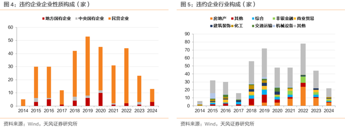 从新增违约主体数据来看,2024年至今仅新增违约主体13家,相比2022年和2023年的44家和23家,新增违约企业数量大幅减少,显示整体信用环境的改善。