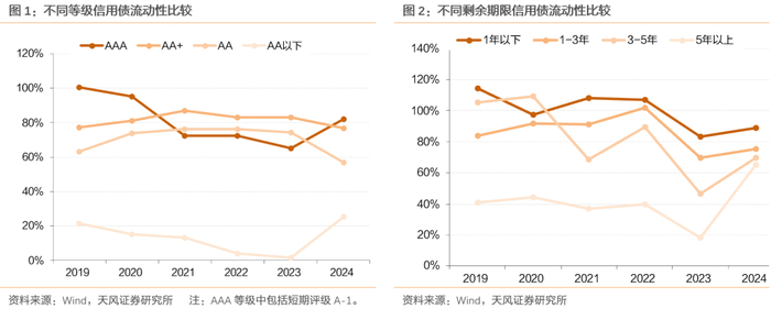 高等级信用债流动性占优。分评级来看,去年AAA评级信用债流动性有所上升,如果考虑到质押式回购的便利性,总体来看中高等级信用债仍然有较高的流动性。中性久期(1-3年剩余期限)的信用债流动性同样表现不错,长久期信用债流动性也在变好。从去年交易数据来看,中高等级、中短久期信用债流动性较好。