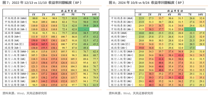进一步观察2022年和2024年两轮市场震荡期各等级、各期限信用债的收益率变化,同样可以发现,高等级债券表现优于低等级。