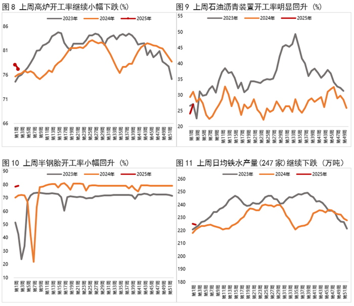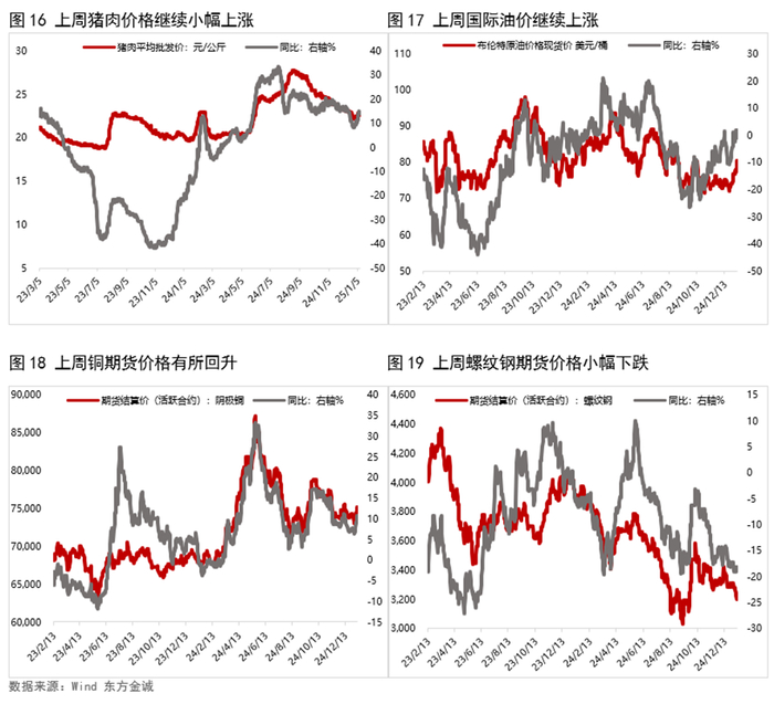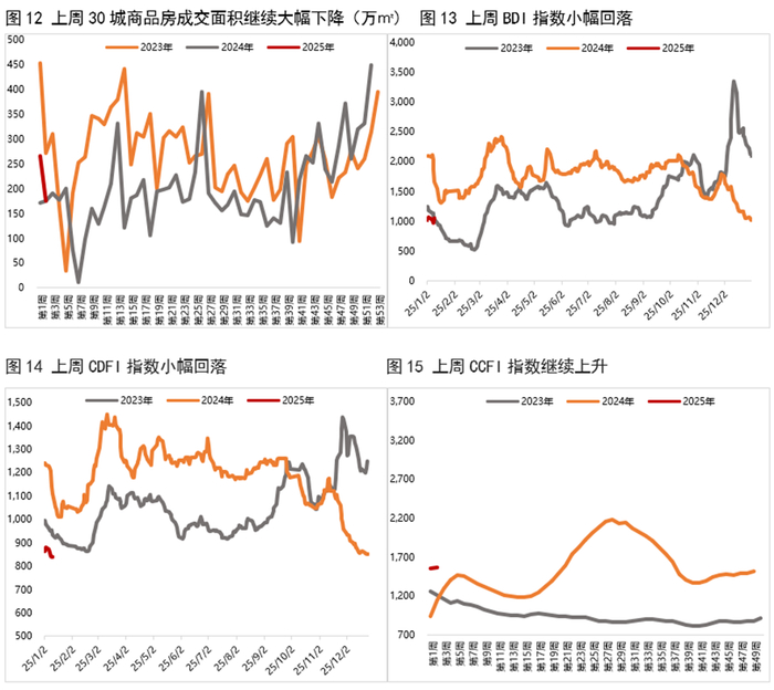 上周生产端高频数据涨跌不一,其中,石油沥青装置开工率、半胎钢开工率有所回升,而高炉开工率、日均铁水产量继续下滑。从需求端来看,上周BDI指数有所回落,出口集装箱运价指数CCFI则继续上升;上周30大中城市商品房销售面积继续大幅下降。物价方面,上周猪肉价格继续小幅上涨,大宗商品价格也多数上涨,其中,铜价、原油价格均上涨,而螺纹钢价格小幅下跌。
