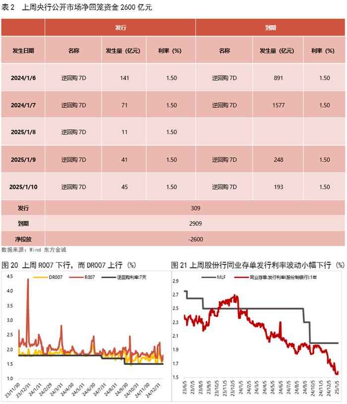 本周(1月13日当周),央行阶段性暂停买入国债对债市短端利率造成的利空影响更大,加之1月为缴税大月且本周适逢税期缴款,春节临近现金需求上升,以及央行近期强调“稳汇率,防空转”,本周资金面料将呈现紧平衡状态,预计债市短端利率调整仍将延续,并给长端带来利空扰动。从基本面来看,本周将发布12月金融、宏观数据,从高频数据表现看,12月底票据利率持续上行,金融数据或好于预期。此外,美国12月非农就业数据大幅超出预期,打压美联储降息预期,或影响国内货币宽松预期。总体上看,尽管年初配置盘仍欠配,每逢调整即买机策略仍有效,但近期利空因素有所增加,本周债市料将偏弱震荡。