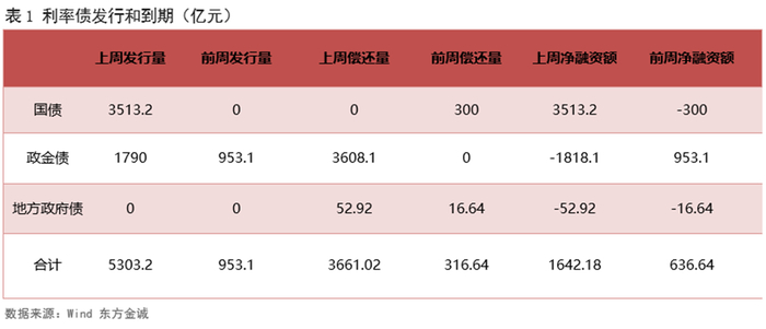 上周共发行利率债26只,环比增加15只,发行量5303亿,环比增加4350亿,净融资额1642亿,环比增加1006亿。分券种看,上周国债发行量、净融资额环比增加;政金债发行量环比增加,净融资额则环比增加,而上周无地方债发行。