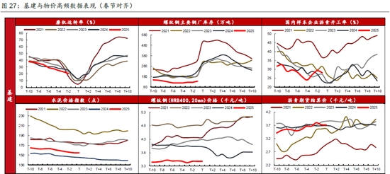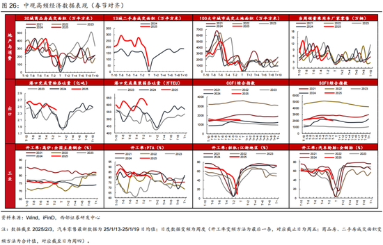 春节前后,地产淡季效应显现,工业生产延续季节性回落。从中观高频数据来看;地产方面,30城商品房、13城二手房假期成交清淡、环比均大幅回落但表现略强于春节季节性,百城土地成交面积环比同比均转负;消费方面,汽车零售回暖较慢;出口方面,港口吞吐量环比走弱但表现仍强于春节季节性,运价指数环比均回落。工业生产延续走弱,高炉开工率环比上升,其余开工率指标环比均下降。