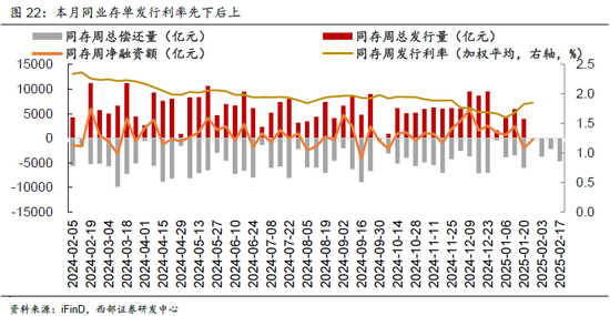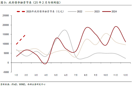 政府债供给前置,不过预计影响有限。25年1月政府债发行1.58万亿,合计净发行9777亿元,2月预计政府债合计发行约2.19万亿,合计净发行约1.5万亿,同比多8808亿元。不过预计供给冲击对资金市场和债券市场影响有限,一方面,当前政府债券市场持续供不应求,另一方面,预计央行将持续使用多种政策工具提供流动性,以熨平政府债供给可能带来的冲击。