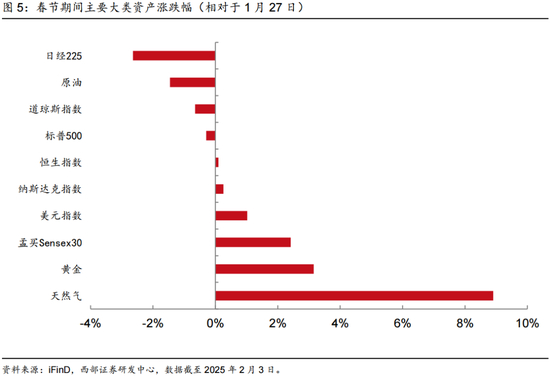 春节期间,春节档票房创历史新高,地产仍待复苏;美联储1月不降息,核心PCE符合预期;COMEX黄金突破2800美元/盎司,天然气涨约9%。