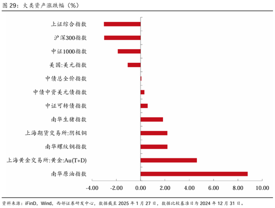 沪深300指数走弱,截至2025年1月27日沪深300指数收报3817.1点,较2024年12月31日下跌2.99%;原油、沪金走强。本月大类资产表现上:原油>沪金>螺纹钢>沪铜>生猪>可转债>中资美元债>中债>美元>中证1000>沪深300。