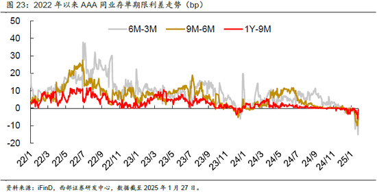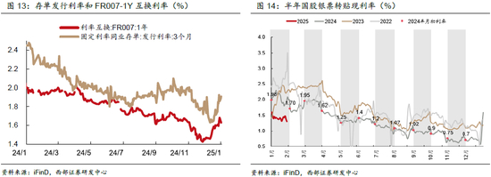 正如我们在报告《迎接2025,不轻易下车但关注回调风险 ——1月固定收益月报》中所述,2024年12月央行超季节性回笼资金,2025年1月若资金投放继续趋紧,则可能带动短端利率上行。从1月债市实际表现来看,在央行稳汇率诉求加强从而控制流动性投放、春节取现叠加1月税期和MLF到期提升资金需求、银行负债端承压下融出能力下降等因素综合影响下,1月资金整体偏紧,带动短端利率大幅上行,截至1月27日,1年期国债到期收益率相较前月末上行22BP,1年期AAA级同业存单上行14BP,3年期国债到期收益率上行12BP;然而长债与资金脱敏,表现具有韧性,10年期国债到期收益率下行5BP,30年期国债到期收益率下行4BP。